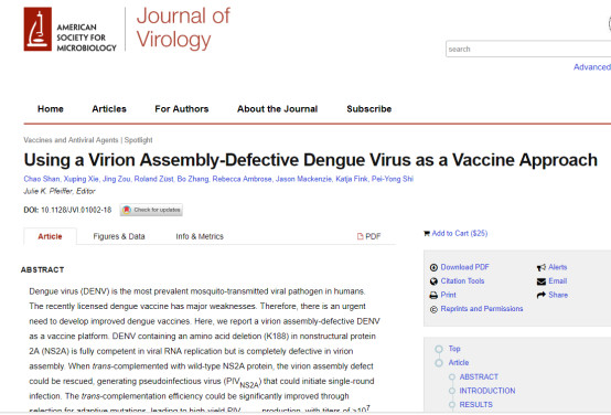 登革熱病毒(DENV)目前流行性最廣的通過蚊蟲傳播的病毒。登革熱病毒感染后可導致患者高熱,頭痛,肌肉、骨關節(jié)劇烈酸痛、部分患者出現(xiàn)皮疹、出血傾向、淋巴結腫大。該病毒主要在熱帶和亞熱帶地區(qū)流行,我國廣東、香港、澳門等地是登革熱流行區(qū)。目前,該病毒還沒有有效的商品化疫苗來預防。近日,來自武漢病毒研究所的科學家和美國的科學家合作,開發(fā)出了一種新的制備登革熱病毒疫苗毒株的方法,該研究成果目前已發(fā)表至《Journal of Virology》雜志,題為“Using a Virion Assembly-Defective Dengue Virus as a Vaccine Approach”。